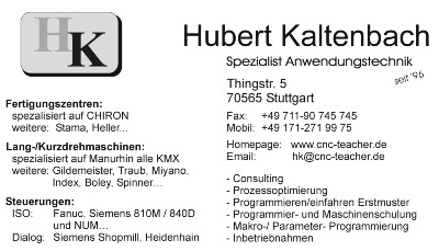 Der Download von Text, Grafik, Programmcode oder Programmquellcode von dieser Domain ist ohne Zustimmung von Hubert Kaltenbach, CNC-Service, Thingstr. 5, 70565 Stuttgart untersagt. Einzige Ausnahme sind die unter >>Download bereitgestellten Dateien.
